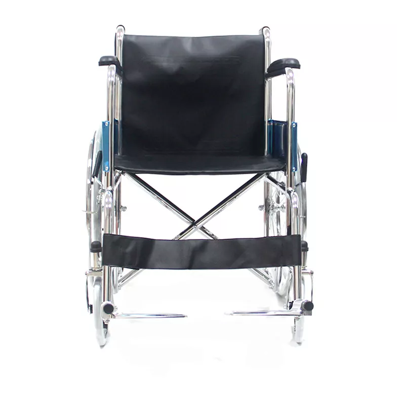 Silla de ruedas plegable con estructura de acero, diseño liviano y funcional, con componentes desmontables.