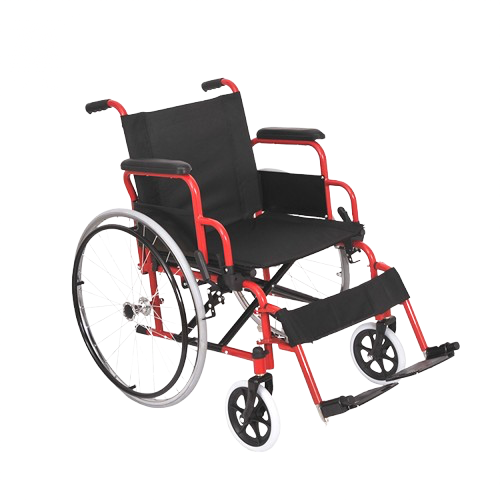 Silla de ruedas plegable con estructura de acero y barras cruzadas dobles, equipada con apoyabrazos abatibles tipo escritorio.
