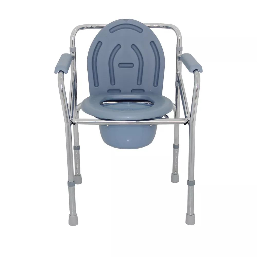 Silla sanitaria plegable con estructura de acero cromado y altura regulable, equipada con cubeta removible.