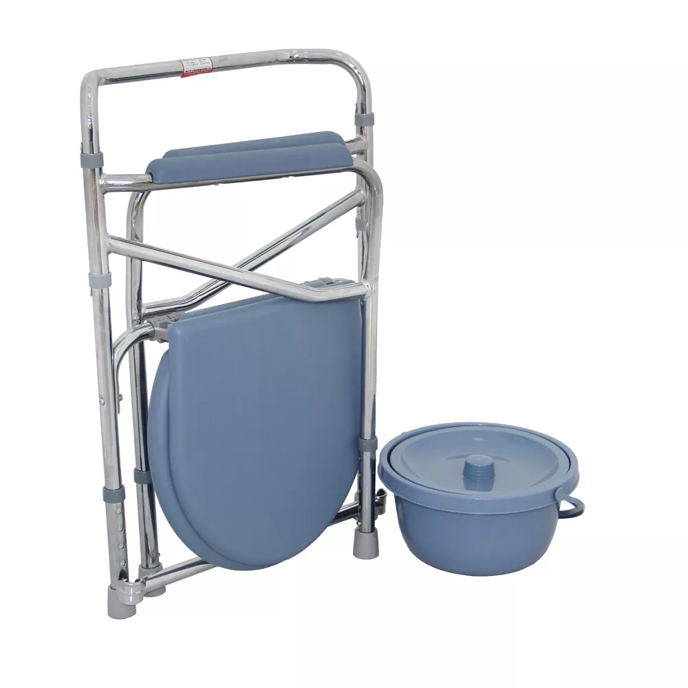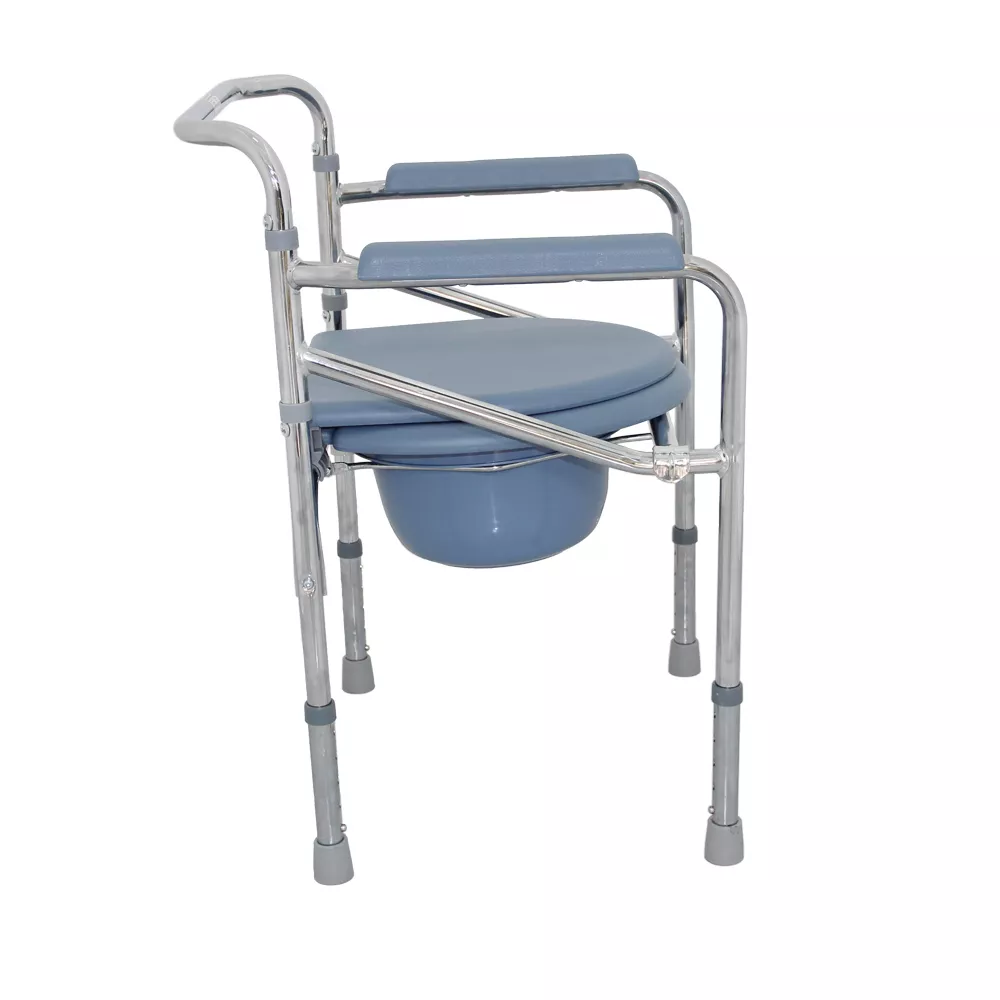 Silla sanitaria plegable con estructura de acero cromado y altura regulable, equipada con cubeta removible.