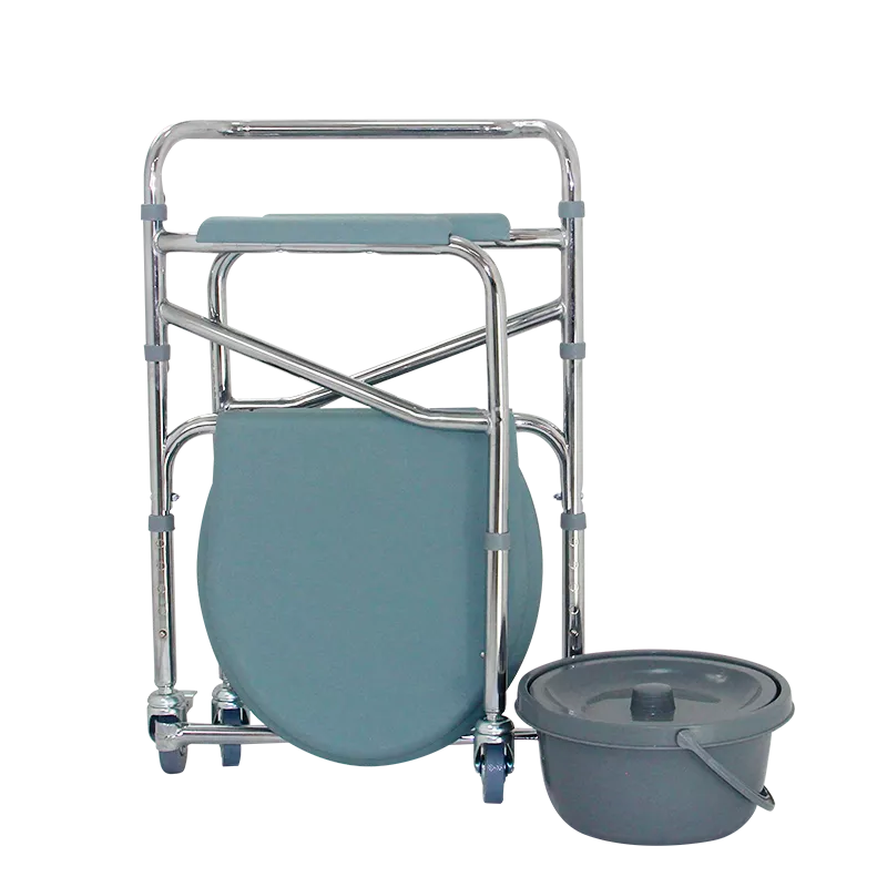 Silla sanitaria plegable con estructura de acero, altura regulable y ruedas con freno.